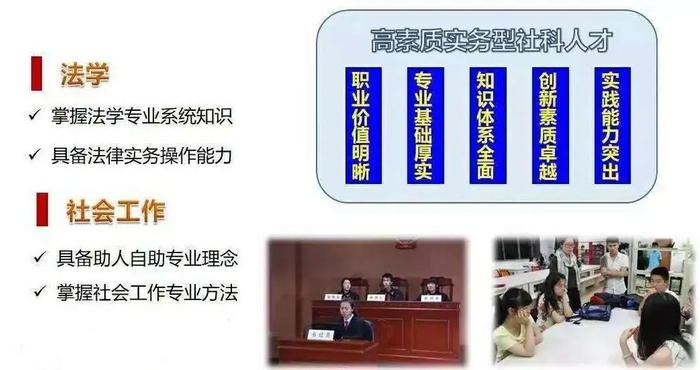 培养掌握法学专业系统知识、具备法律实务操作能力的的高级法学人才,培养具备助人自助专业理念、掌握社会工作专业方法的高素质实务型社科人才。