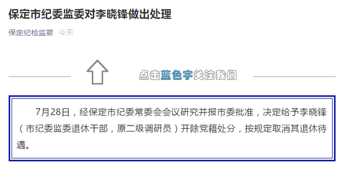 新京报快讯 据保定纪检监察官微消息,7月28日,经保定市纪委常委会会议研究并报市委批准,决定给予李晓锋(市纪委监委退休干部,原二级调研员)开除党籍处分,按规定取消其退休待遇。