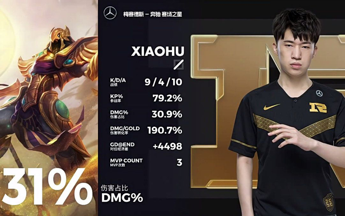 与DMO的比赛,李元浩证明了自己。第二局比赛,RNG一直被DMO压制,关键时刻他果断闪现推人,让对方C位暴露在本方射手的输出范围,2换3打赢了团战,并最终完成了翻盘。这局比赛,李元浩比对方中单经济高了4498,参战率79.2%,伤害占比30.9%,伤害转化率190.7%,顺利当选单局MVP。