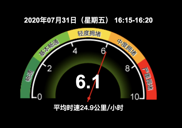 此外,受到降雨影响周五的晚高峰有所提前,截止至16时20分,北京交通指数已经达到了6.1,属于中度拥堵级别。交管部门表示,目前西、北部地区降雨较大,受强雷阵雨天气出现,周五晚高峰预计交通压力将会较大,建议尽量减少出行。