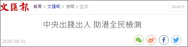与此同时,香港《文汇报》援引权威消息人士称,中央政府应特区政府请求,将会倾力相助香港抗疫。由于抗疫战中检测至关重要,中央政府不惜出钱出力出人,派遣国家卫生健康委员会和广东省的检测团队来港,为全港市民免费进行新冠肺炎核酸检测,相关的费用全数由中央政府出资。在香港疫情彻底受控、彻底切断传播链前,有关的团队会一直留港提供支援。