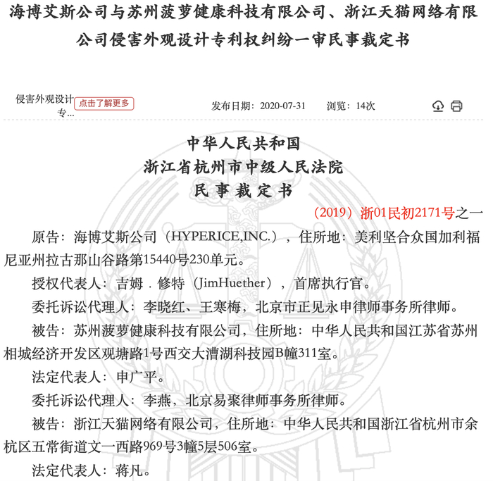与之类似,裁判文书网今年7月31日披露了一份由杭州市中级人民法院作出的民事裁定书显示,原告海博艾斯公司(HYPERICE,INC。)将菠萝健康、浙江天猫网络有限公司告上法庭,原因是侵害外观设计专利权纠纷。