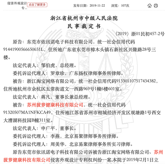 裁判文书网去年11月22日披露了一份由杭州市中级人民法院作出的民事裁定书,裁定书显示,原告东莞市依讯诺电子科技有限公司将菠萝健康、浙江天猫网络有限公司告上法庭,原因为侵害外观设计专利权纠纷。