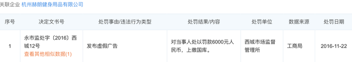 记者注意到,赫朗健身曾发布虚假广告被罚。企查查显示,2016年11月22日,赫朗健身被西城市场监督管理所处罚,处罚结果是对当事人处以罚款6000元人民币。