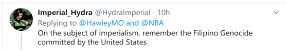 “说到帝国主义,记住美国在菲律宾制造的种族灭绝事件吧。”