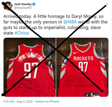 很明显,球员可以展示的标语多与当前美国国内的严重社会矛盾有关。于是,这成功戳到了特朗普所在共和党政客的敏感点,其中就包括霍利。他拿所谓的“言论自由”说事,指责NBA将球衣上的标语限制为“预先获批的社会正义口号”,还阴阳怪气地声称NBA在中国赚了很多钱,建议展示乱港标语。