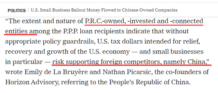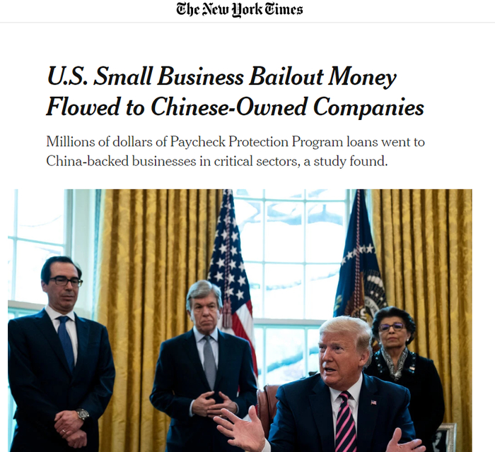 《纽约时报》这篇文章是从美国特朗普当局在疫情之下给美国中下企业下发的“补贴”入手的:一边攻击特朗普,说他的“补贴”没有惠及美国,而是出卖了美国的利益;一边则煽动反华情绪,称这些由美国纳税人掏钱的“补贴”中有不少是被“中国企业”拿走了。