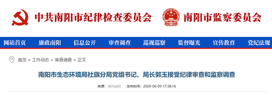 南阳市纪委监委官网消息显示,2020年6月9日、10日,11日3天内,南阳市生态环境保护局下属社旗分局党组书记、局长郭玉,淅川分局副局长贾中富,卧龙分局党组成员、副局长李自山分别因涉嫌严重违纪违法被带走调查。7月10日,卢志武落马。5天后,淅川分局党组副书记、副局长陈阵隆也被带走调查。