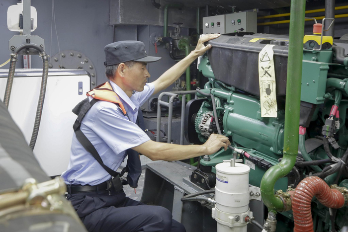 根据规定,船艇航行期间,每隔半小时就要下机舱检查一次,尤其要防止发动机过热。多年的经验加持,老法师自有过人之处——发动机的温度有多高,李勤用手就能摸个大概。摸发动机也有技巧:“手掌要弯曲并拢,手心朝上,用手指关节处轻触机身,不容易被烫着。”