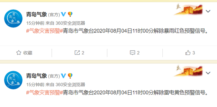 8月4日11时,青岛市气象台解除暴雨红色预警信号和雷电黄色预警信号。