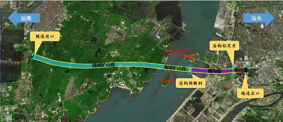 汕头湾隧道,分为海域段和路域段,其中穿海域段一共3公里长,最大埋深达海面下56米。隧道采用“明挖法+矿山法+盾构法”,设进出口和两个斜井,多个工作面共同掘进施工。