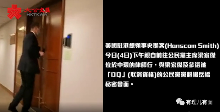实际上,美、英领馆除了按照既定策略推进外,还不时的与乱港组织及其头目密会,交流意见,结合形势变化,动态制定调整新的乱港策略。这不,8月4日,据港媒爆料,美国驻港澳总领事史墨客形迹可疑地出现在公民党主席梁家杰位于中环太子大厦的律师楼里,一同参与秘密会见的还有公民党立法会议员杨岳桥。