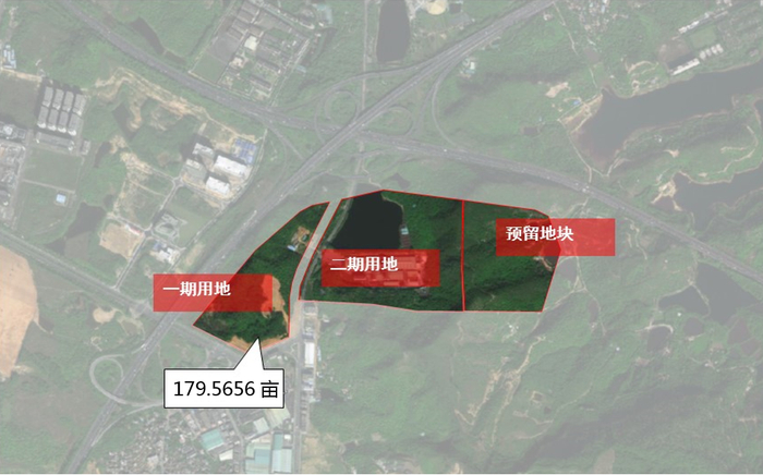 校区用地面积523.9185亩,分为两期进行规划,其中一期用地面积179.5656亩,二期用地面积344.3529亩(包括湖及山体)。