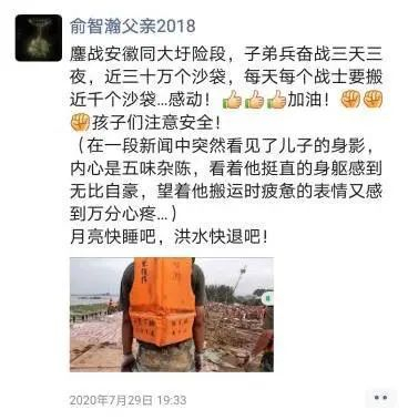 “月亮快睡吧,洪水快退吧!”俞智瀚的父亲将这句话落在朋友圈的最后。这天,他在电视上看到了儿子的背影,比印象中更挺拔、更坚毅,却离漫涨的洪水那么近,近得让人揪心。