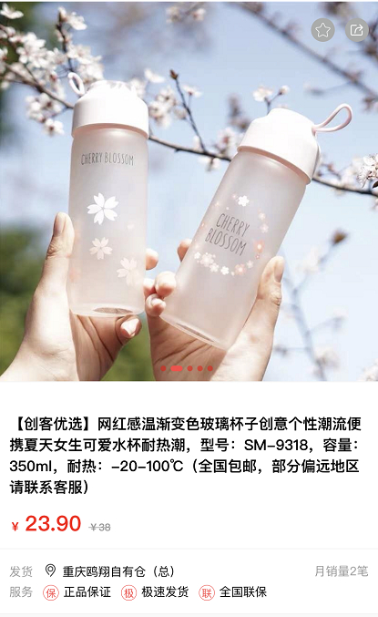 美吗?“重百创客”推荐这款以樱花为创意设计的感温渐变玻璃水杯给你,采用健康的食品级材料,水温达到37℃后,杯身还会感温变色。