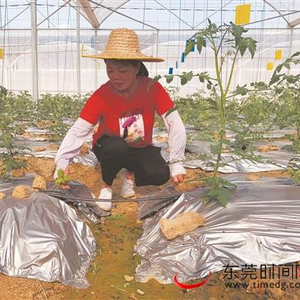 ■东莞引导韶关仁化县江头村通过土地流转建设蔬菜种植基地。图为江头村贫困户李有妹在蔬菜基地里除草