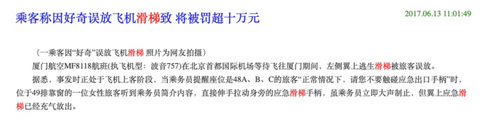 近年来,乘客在非紧急状态下擅自拉开飞机应急舱门、放下滑梯的新闻屡见不鲜。