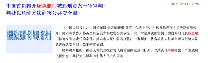2015年,吉林省延吉市人民法院开庭审理我国第一起乘客擅开舱门案例,以涉嫌以危险方法危害公共安全罪对擅自打开飞机应急舱门的犯罪嫌疑人朴某提起诉讼。