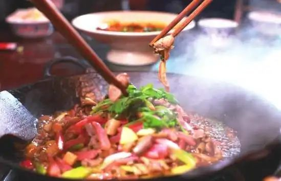 黔江鸡杂:传统土家方式烹饪,以鸡心、鸡胗、鸡肠、鸡肝等为主原料,辅以尖头泡椒、泡萝卜丝、土豆、葱姜蒜,色鲜味美、酸爽香辣。