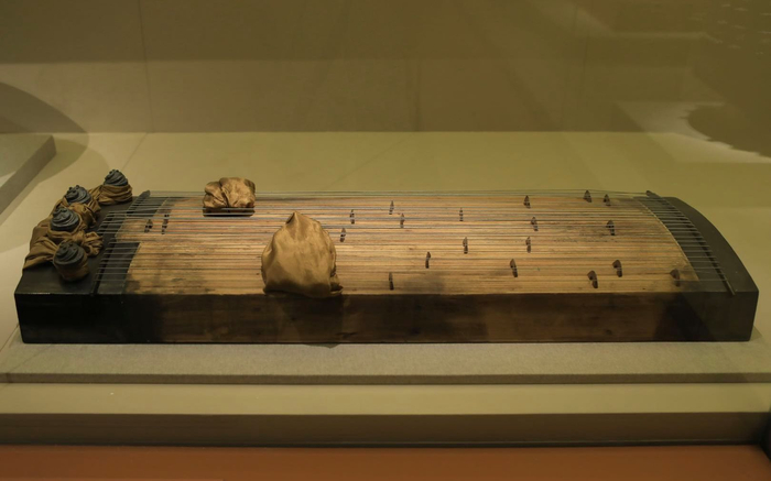 早期中华文明遗址中,就有以笛、哨为代表的吹乐器和以钟、鼓为代表的击乐器。先秦至汉代,随着礼乐制度的建立和发展,乐器更加复杂化,出现了编钟、编磬等大型乐器,同时,以琴、瑟为代表的弹弦乐器产生,成为文人雅士精神文化生活的重要组成部分。展览中展出了来自湖南博物馆的马王堆1号墓瑟,出土时瑟的25根丝弦完整保留在原位置,25个拱桥式木柱也保持在原位,这是迄今考古发现的唯一上古瑟调弦实例。