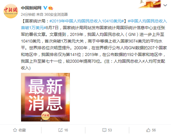 8月7日,国家统计局网站发布国家统计局国际统计信息中心主任张军的署名文章。文章提到,2019年,我国人均国民总收入(GNI)进一步上升至10410美元,首次突破1万美元大关,高于中等偏上收入国家9074美元的平均水平。世界排名位次明显提升。2000年,在世界银行公布人均GNI数据的207个国家和地区中,我国排名仅为第141位;2019年,在公布数据的192个国家和地区中,我国上升至第七十一位,较2000年提高70位。(注:人均国民总收入≠人均可支配收入)
