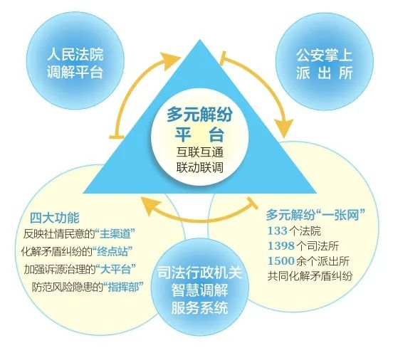 当前,以“全流程再造、全平台贯通、全天候服务”为核心内容的多元解纷平台借助“互联网+”打破信息壁垒,融合平台优势,实现了人民法院、公安机关、司法行政机关平台互联、数据互通,也让人民调解、行政调解、司法调解实现了无缝对接。