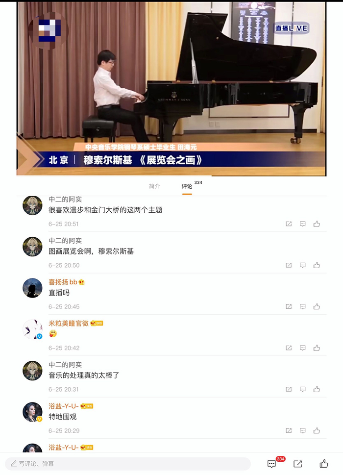 6月25日,钢琴系2020届硕士毕业生田海元的“云上毕业音乐会”,在多个直播平台播出,吸引了众多网友观看和留言。图片来源于网络截图