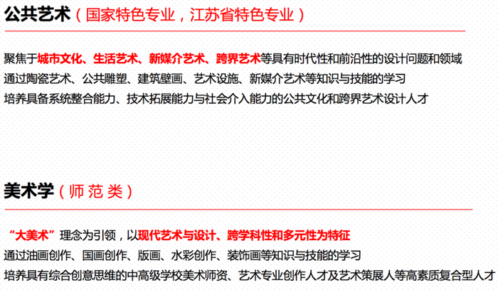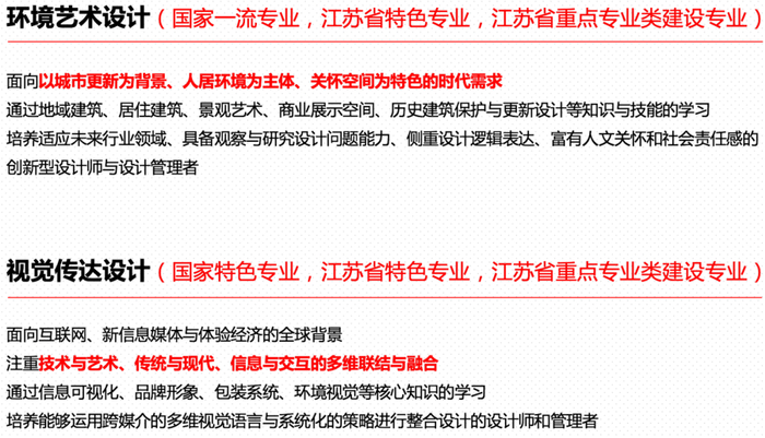 设计学科排名在全国第四轮学科评估中列A类,2018 年软科中国最好学科排名第二。曾4次荣获国家级教学成果奖,是国家“211”工程重点建设学科。学院设有“设计学”一级博士点,具有“设计学”和“美术学”硕士学位授予权,以及工业设计工程和艺术硕士(MFA)专业硕士学位授予权。艺术设计专业教学团队为国家级教学团队,产品创意与文化研究中心为江苏省高校人文社科重点研究基地。学院是教育部高校设计学类专业教学指导委员会委员单位、工业设计类专业教学指导分委员会副主任单位、教育部工业设计工程硕士综合改革试点单位。