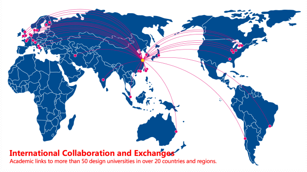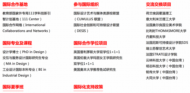 学院与美国辛辛那提大学、意大利米兰理工大学、荷兰埃因霍芬理工大学、英国普利茅斯大学、日本千叶大学、瑞士苏黎世艺术大学、芬兰阿尔托大学、芬兰拉赫蒂应用科技大学、香港理工大学等50余所国际或境外著名设计院校和设计企业,通过暑期合作课程、师资交流、合作科研项目、联合培养、推免研究生等形式,在教学和研究方面保持着常态性的教学和科研合作。