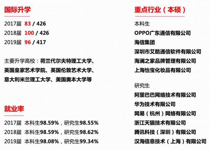 学院连续多年就业率均保持在90%以上,升学出国率保持在30%以上,考取国内研究生的高校有清华大学、同济大学、上海交通大学等,国外升学英国伦敦艺术大学、美国伊利诺伊理工大学、荷兰埃因霍温理工大学、意大利米兰理工大学等。