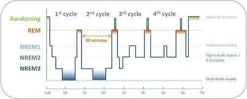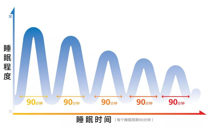 人一晚上的睡眠要经历4-5个周期。按照脑波的状态我们每一个睡眠周期分为“快速眼动”和“非快速眼动”。正常情况下,快速眼动和非快速眼动交替进行,一个晚上大约要交替4-5次。成年人的睡眠周期,每个周期90分钟左右,每一个周期里又分为入睡、浅睡、熟睡、深睡和做梦(快速眼动)五个阶段。