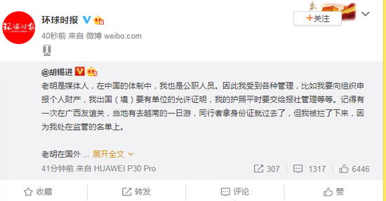 老胡是媒体人,在中国的体制中,我也是公职人员。因此我受到各种管理,比如我要向组织申报个人财产,我出国(境)要有单位的允许证明,我的护照平时要交给报社管理等等。记得有一次在广西友谊关,当地有去越南的一日游,同行者拿身份证就过去了,但我被拦了下来,因为我处在监管的名单上。