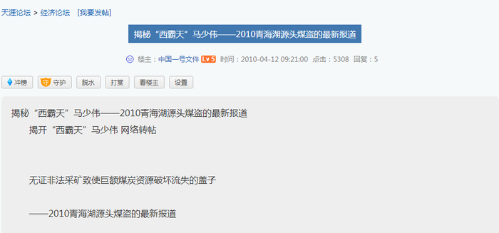 近10年间,网上各大论坛不断有举报、披露兴青集团非法盗采行为的帖子。其中,马少伟被网友称为独霸一方的“西霸天”、无所畏惧的“煤盗”。