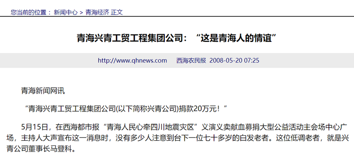 2008年汶川地震时,兴青集团为灾区捐款20万再次被报道,被称为“这是青海人的情谊”。