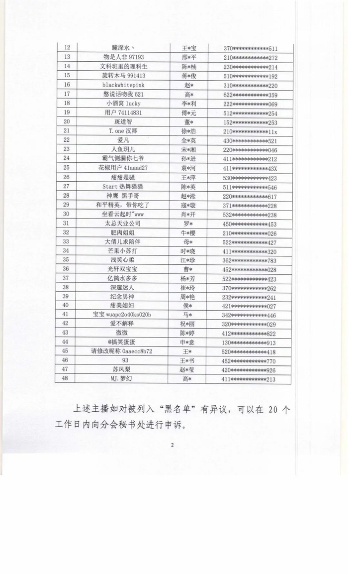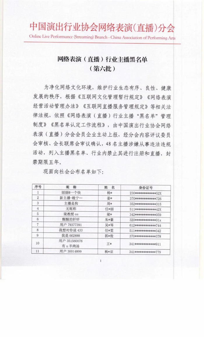 新京报快讯 据CAPA网络表演直播分会微信公众号消息,根据《互联网文化管理暂行规定》《网络表演经营活动管理办法》《互联网直播服务管理规定》等相关法律法规,按照《网络表演(直播)行业主播“黑名单”管理制度》《黑名单认定工作流程》规定,中国演出行业协会网络表演(直播)分会现向社会公布第六批主播黑名单,被列入黑名单的主播将在行业内禁止注册和直播,封禁期限5年。现将名单公布如下: