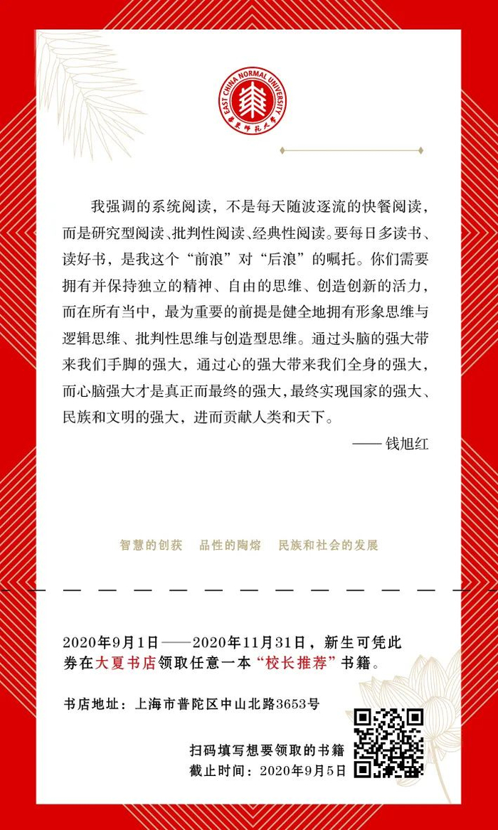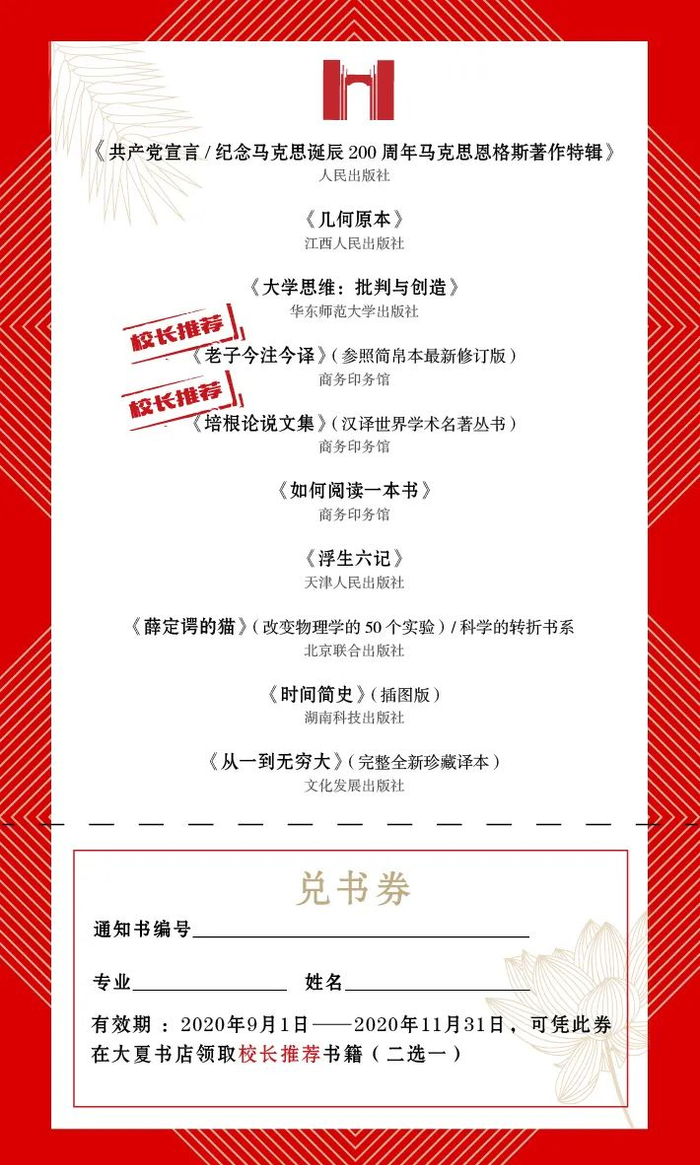 开学后,你可凭这张书券在中山北路校区大夏书店领取校长推荐的两本书中的一本。