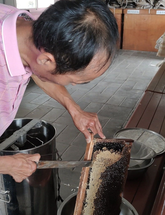 王师傅用的是最传统的手摇蜜的方法,转动桶上把手,蜂脾在桶中飞快转动,因为离心力的作用,蜂蜜被甩落,桶口处也被摇出了带有蜂蜜花香的甜甜的风。