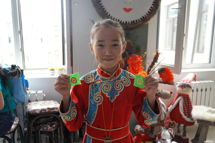 这位拿着彩色珠子的小姑娘叫英格蕊,9岁的她已经接触鄂温克族手工艺品两年多了,她缝制的图案将用于制作“太阳花”头绳。她的妈妈是这家公司的员工,再加上奶奶也常在家制作鄂温克族手工艺品,从小耳濡目染,年幼的她也早早加入到了传承鄂温克族传统文化的队伍中。