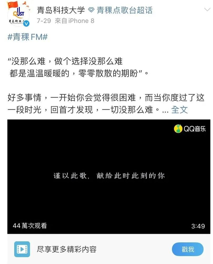 原标题:“我的耳机分你一半,和青科一起听歌吧”