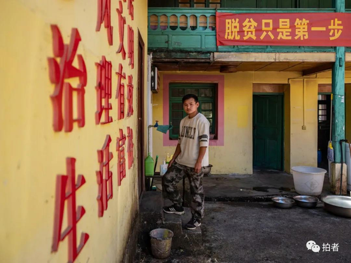 △ 7月27日,献九当村副主任肖龙站在村委会门前,他身后的横幅上写着“脱贫只是第一步,更好的日子还在后头”。