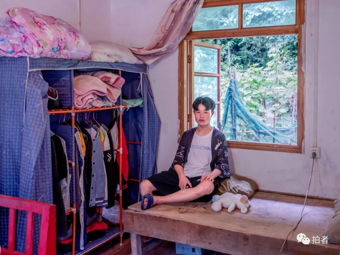 △ 7月30日,彭金刚身穿一件宽松的外套坐在自己的木床上。他说,“我喜欢这种款式,宽宽大大,没有拘束”。17岁的彭金刚目前正在等候高中录取通知。他平日喜欢打游戏、绘画、打篮球,假期打算在乡里找一份兼职锻炼自己。