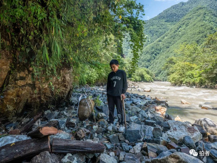 △ 7月27日,小学生黎志远拿着斧头站在江边,他正为眼前的一根巨大树木发愁,“这么大怎么背回去啊”。一早,他的爷爷就在江里打捞起一根残木,做了标记,打算背回家烧火。临近中午,他的叔叔用电锯将树木分割,再由其他家庭成员将木材背回。森林,对于独龙族人来说,是祖辈传承的生活资料。过去,生火做饭、毁林开荒、盖屋乔迁,随处都要用到木材。随着近年环保意识的深入人心,居住在独龙江边的村民对于保护森林的意识也越发增强。“山上的树木,不能随便砍伐,我们要保护大山。”黎志远说。