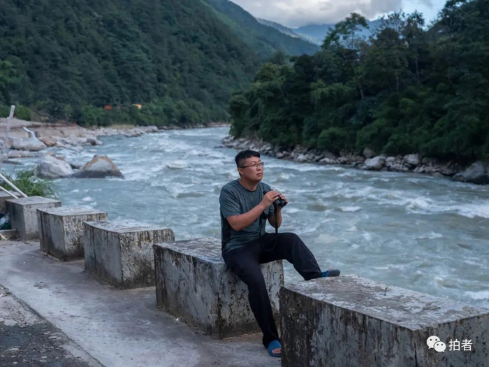 △ 7月28日,扶贫队长徐迅东手拿望远镜坐在江边,观望对岸的森林。近段时间,他热衷观鸟,努力寻找观鸟点,希望为当地开发一条观鸟拍鸟的旅游线路。