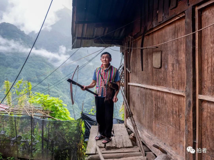 △ 7月31日,金学强拿着独龙族弓弩站在自家的老房子前。金学强62岁,年轻时是献九当村有名的猎手。“每次上山捕猎,事先要将箭头蘸上植物毒液,弓弩和弓弦要反复擦拭。最多一次和老猎人一起捕获过熊、野牛和山羊”。随着野生动物保护法的实施,当地环保政策的陆续出台,当年的老猎手早已将弓弩束之高阁。现在的金学强主要从事草编和种植。30多年的草编手艺,让他的产品不愁销路,只此一项,一年就有8000元收入。