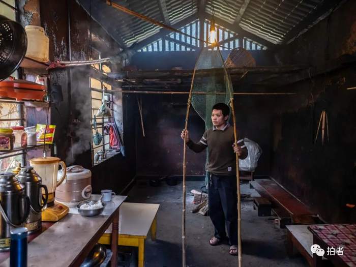 △ 7月27日,孔志强将渔网从厨房屋顶拿下来擦拭。渔网放了一年,竹竿上积满了灰尘。孔志强48岁,是当地的草果大户。他捕鱼不仅是为了自家食用,也能为了增加些收入。“夜晚,我们手持渔网站在江边,各自找好下网的水面,人要站稳,将两支竹竿插入江中,等待鱼儿游进渔网,就可起网捕鱼。最好的时候,一晚上可以捕获几十条。现在不能随便捕鱼,要等禁渔期结束”。2020年禁渔期为4月1日~8月31日,禁渔范围为贡山县辖区内所有江、河、湖等天然水域。