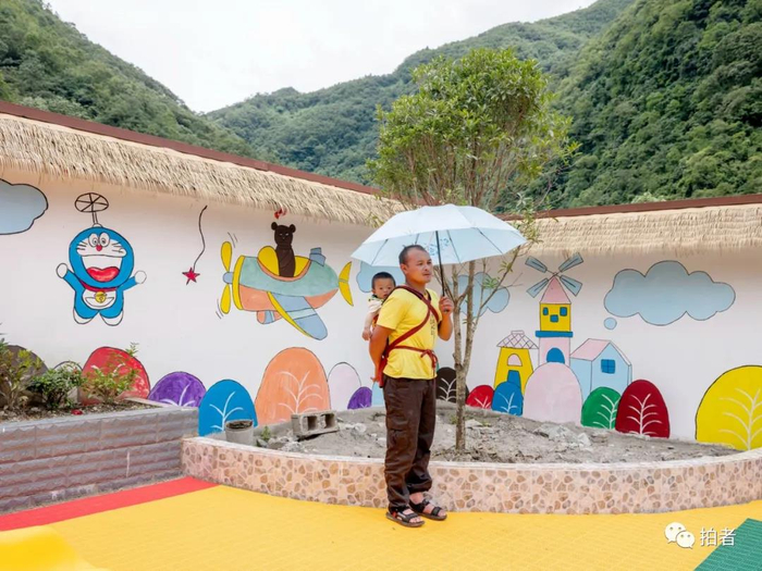△ 7月31日,肖加利撑着阳伞,背着二女儿站在幼儿园的操场边,他和妻子一同参加大女儿的期末典礼。肖加利32岁,是独龙江乡献九当村村民。家中养育两个女儿,大女儿5岁,上幼儿园中班,除了少量餐费,其他学杂费全免。肖加利认为教育非常重要,“之前我们没有现在这么好的条件,但我只要有能力,一定要让孩子接受好的教育”。