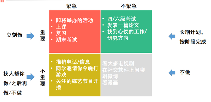 虽然“鱼和熊掌不可兼得”,但是丁瑞琳却做到了学习工作两不误,其中奥秘在于“效率”。她大方地分享了提高办事效率的小妙招:“将近期要做的事情分为紧急又重要、重要但不紧急、紧急但不重要、不重要又不紧急四类,安排好后百分百地投入自己在做的事情,保证时间的同时保证效率。”