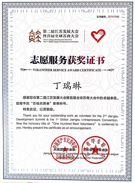 丁瑞琳一直坚定地走在社会实践的路上,积极参加各种志愿活动,并在江苏发展大会的志愿服务中获得“百佳志愿者”省级荣誉,这一次服务是她参与的所有志愿活动里时间最长、规模最盛大的,学习到的东西也更加宏观。在志愿者培训的过程中她系统地学习了服务活动的基本素质, “在活动的过程中我了解到江苏发展大会举办的流程、意义,见识到来自各界的成功人士,开阔了眼界,充实了我的知识储备,并且在身心上都给予我极大的激励作用。”参与各种志愿活动的过程中,她还结识了一群志同道合的优秀伙伴,在与他们的交流中,丁瑞琳遇见了更好的自己。