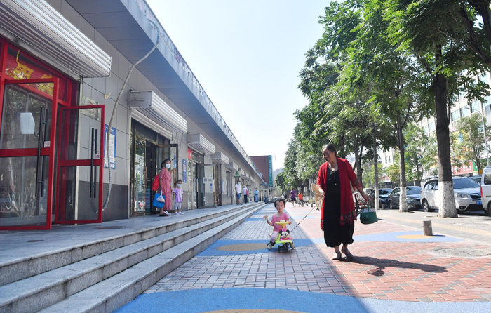 今天(8月10日)9时许,记者来到贵园8号路,在这里经营的底商有水果店、肉店、家政服务公司、药店等。整条道路虽然不长,商户数量却不算少,共有28家。上午,居民们纷纷来这里购物。人行道宽敞、整洁,孩子们在这里滑起滑板车,拄着拐杖的老人也能在便道上散散步。