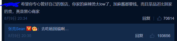 8月9日,拥有2400万粉丝的知名男模张亮一条微博下,有网友评论称:“希望你专心管好自己的饭店,你家的麻辣烫太low了,加麻酱都要钱,而且菜品还比别家的贵,真是黑心商家。”张亮回复该条评论称:“去吃杨国福啊……”